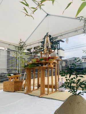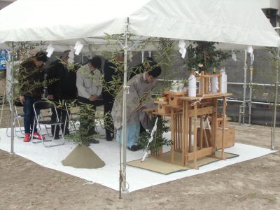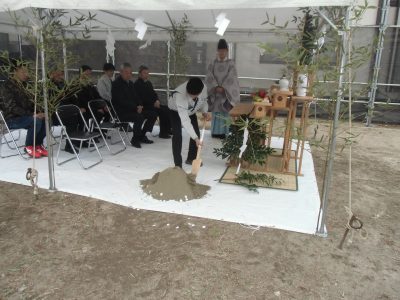 ・地鎮祭(じちんさい、とこしずめのまつり)とは、土木工事や建築などで工事を始める前に行う、その土地の守護神(鎮守神)を祀り、土地を利用させてもらうことの許しを得る。(Wiki参照)https://ja.wikipedia.org/wiki/%E5%9C%B0%E9%8E%AE%E7%A5%AD
